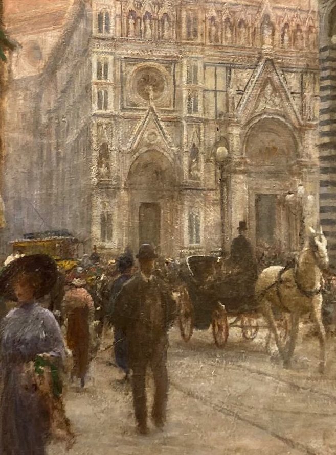 Il legame imprescindibile che Fabbi ebbe con la città fiorentina è palesato sapientemente in questa tela, notevole finestra aperta verso un’affollata piazza del Duomo prima della sera.