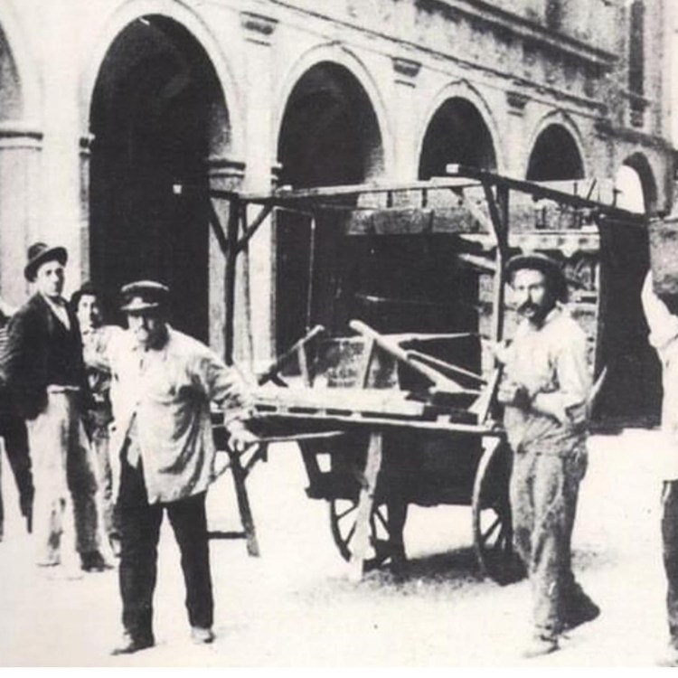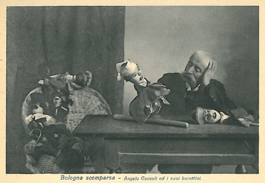 Si tratta del famoso circolo dei burattini di Angelo Cuccoli (1834-1905), che rimase attivo per molto tempo sotto il Voltone del Podestà guardando verso Palazzo d’Accursio. Il suo teatrino fu una vera e propria “tradizione di famiglia“. Lo precedette infatti il padre, Filippo Cuccoli (1806-1872). Prima Filippo e poi Angelo scelsero di alloggiare il proprio teatro in piazza Maggiore, luogo strategico e ricco di significato simbolico.