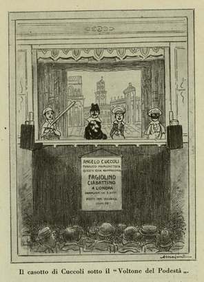 Cuccoli, dopo varie esperienze in compagnie girovaghe, tornò a Bologna e nel 1857 debuttò nel casotto del padre. Dal momento che aveva una voce timida ed incerta, non poteva certo competere con Filippo nella maschera di “Sandrone”, pertanto, recuperò quella di “Fagiolino” adattandola alle sue possibilità vocali e mettendo in evidenza l’arguzia e la finezza del personaggio. Dopo circa quindici anni, alla morte del padre, Angelo rifondò tutto il suo repertorio, basandosi sempre sulla commedia dialettale, ma integrandola con originali storie del teatro italiano e francese e adattandola al gusto e ai desideri del popolo bolognese. Tra i suoi collaboratori vi fu anche Augusto Galli, inventore di “Sganapino”. (cfr. qui)