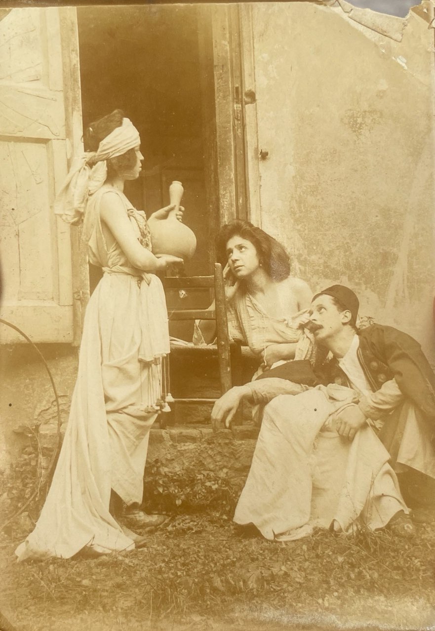 Vestite di gran lusso, insieme sono l’immagine tangibile di come Fabbi pensava alla figura femminile nel proprio contemporaneo. La grande attualità con cui egli le descrive scardina infatti il concetto di donna di fine Ottocento. La prima, vestita con un candido abito bianco e delicati pois, ha accanto un ombrellino rosa rovesciato sul prato. Dettaglio da non sottovalutare poi, le calze arancioni che sbucano simpaticamente dal vestito. Accanto a lei siede la sua amica che, con un cappellino di paglia impreziosito da piume nere, sfoggia un abito a righe blu e rosa da far invidia alle donne di Boldini o De Nittis […]