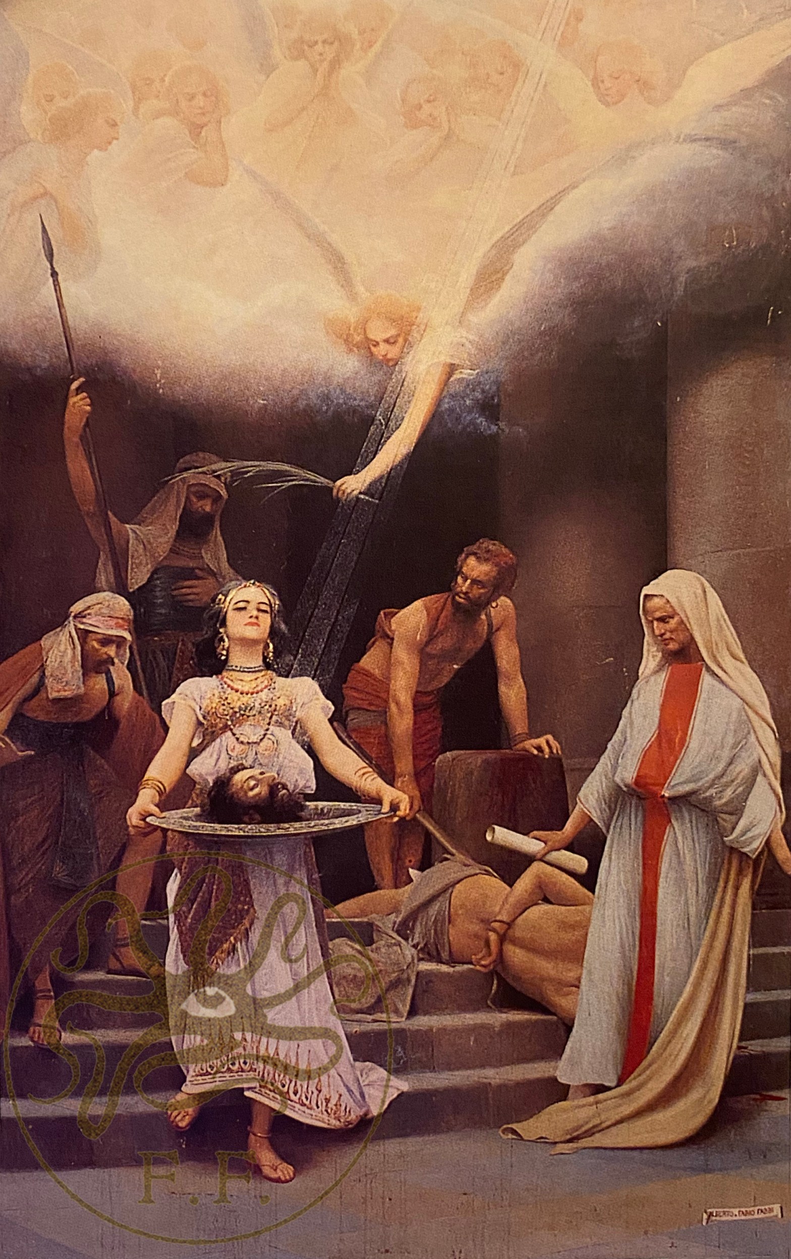 La grande pala della Salomé con la testa di Giovanni Battista di Alberto e Fabio Fabbi, che oggi svetta nell’abside della chiesa, costituisce uno dei vertici pittorici di Fabbi: essa raggiunge una sintesi assoluta tra Purismo, Simbolismo ed Orientalismo. La posa dei personaggi e lo sguardo sprezzante della protagonista denunciano riferimenti ad un gusto per il teatro e la scenografia. Il capolavoro ha però subito notevoli peripezie …..